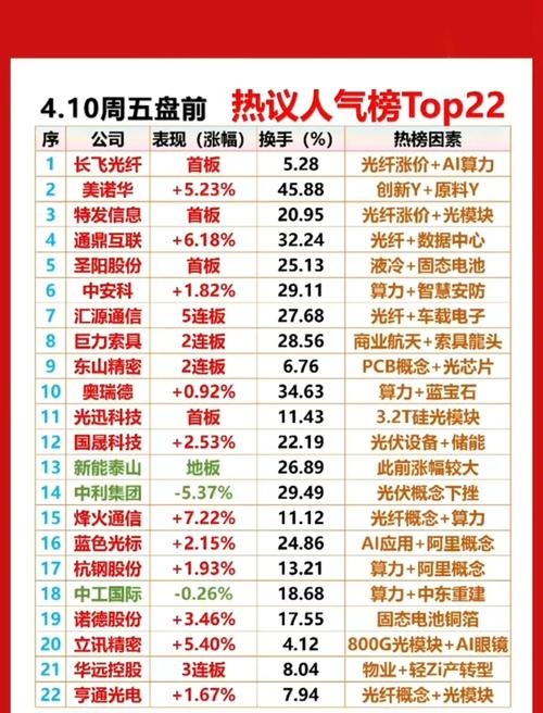 4.10周五成交活跃个股+人气热度榜! 1.光纤光缆涨价+光模块 2.液冷+固态电池 3.PCB+光芯片 4.阿里概念+算力 5.固态电池+铜箔