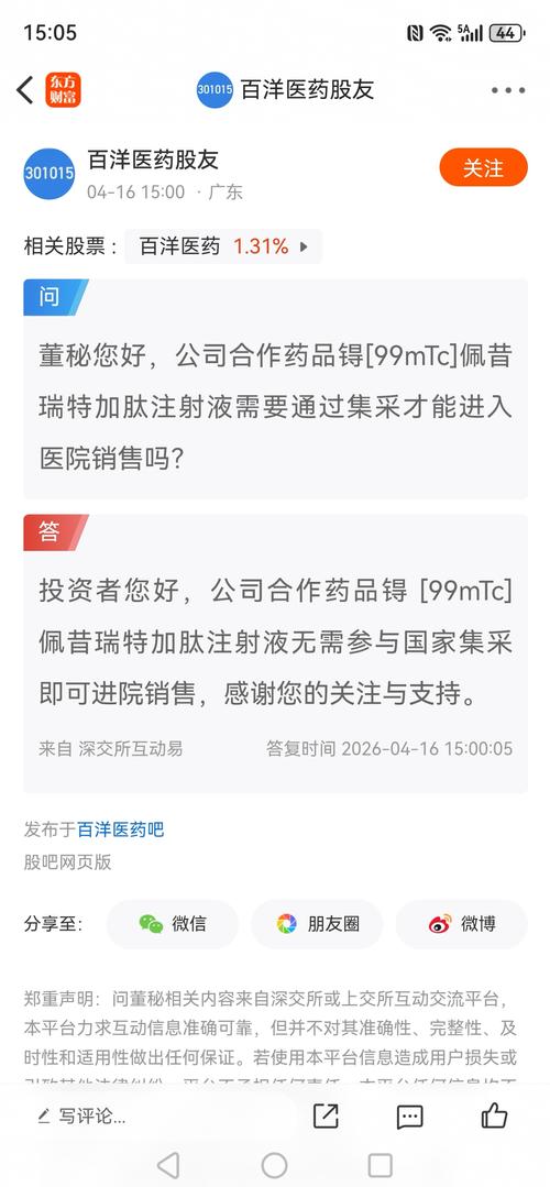 【问】董秘您好,公司合作药品锝[99mTc]佩昔瑞特加肽注射液需要通过集采才能进入医院销售吗?【答】百洋医药:投资者您好,公司合作药品锝[99mTc]佩昔瑞特加肽注射液无需参与国家集采即可进院销售,感谢您的关注与支持。