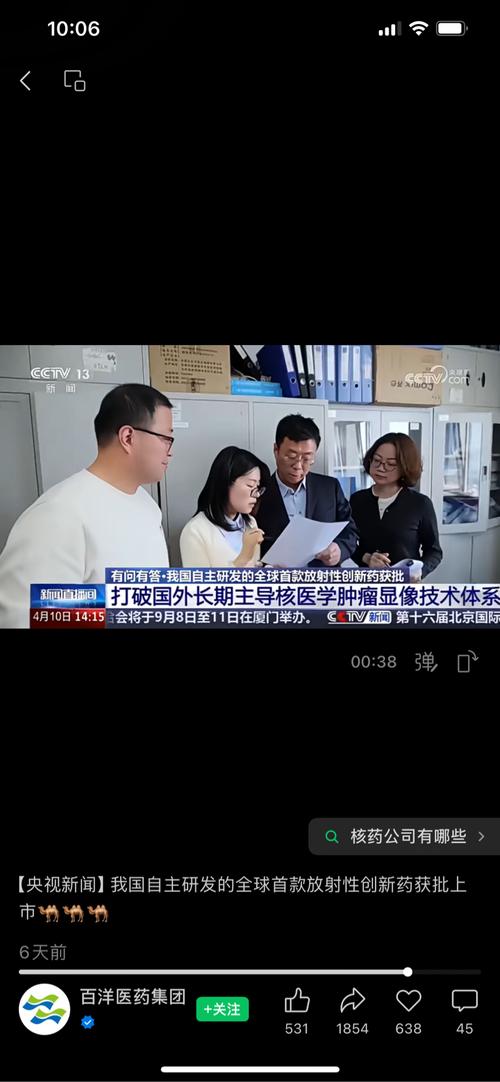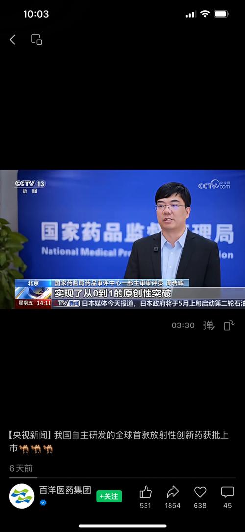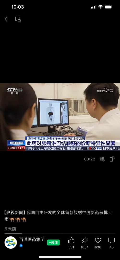 $百洋医药(SZ301015)$ 央视报道:我国自主研发全球首款放射性创新药「吉伦泰」获批 一、核心信息概览 •药品名称:锝[99mTc]佩昔瑞特加肽注射液,商品名吉伦泰(代号99mTc-3PRGD2) •获批时间:2026年4月2日,国家药监局通过优先审评审批程序批准上市 •核心定位:中国首个自主研发的1类创新核药、全球首个用于SPECT显像的广谱肿瘤显像剂 •商业化主体:百洋医药(301015...