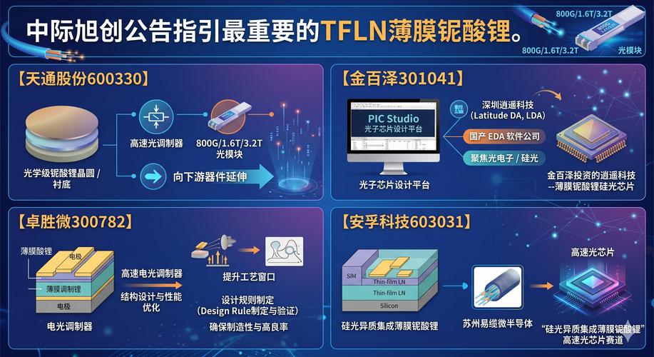 中际旭创强劲的财报数据,同比接近增长两倍, 中际旭创公告指引最重要的TFLN薄膜铌酸锂 金百泽:商业航天+机器人+光通信+薄膜铌酸锂硅光芯片+智能机器+数据中心+PCB+5G/6G+虚拟电厂+无人机+汽车电子+国防军工+腾讯/百度+毫米雷达++特高压+新型工业+创投,通过旗下产业基金投资了深圳逍遥科技(LatitudeDA,LDA),这是一家聚焦光电子/硅光/特色工艺的国产EDA软件公司,核心是P...
