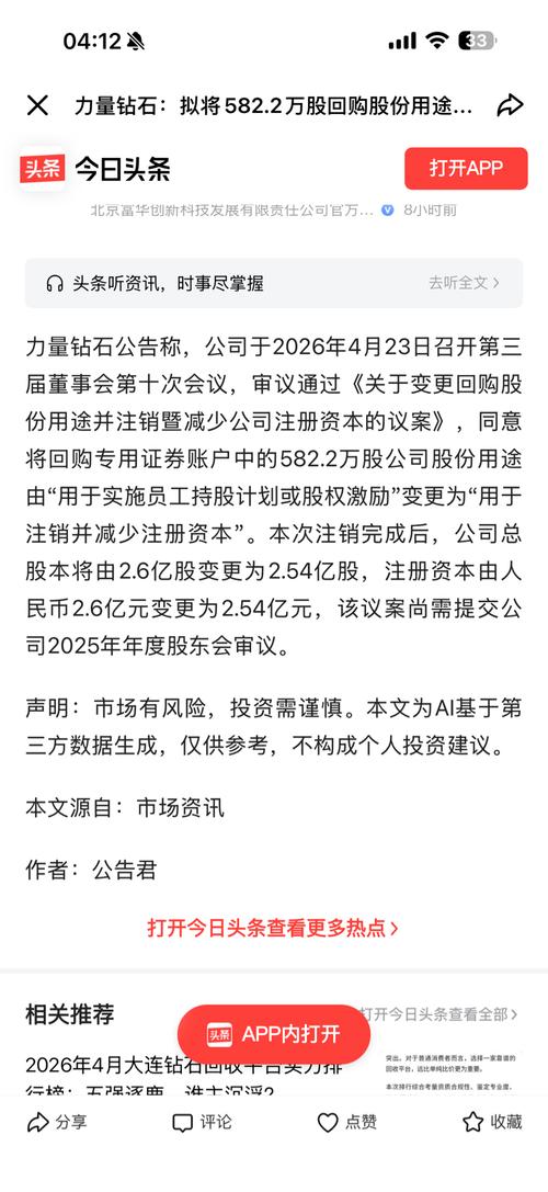 $力量钻石(SZ301071)$$四方达(SZ300179)$$华电辽能(SH600396)$ 力量钻石回购注销深层逻辑,大行情蓄势待发 正文 看透力量钻石全额回购注销核心逻辑: 大股东极度认可当前低估底部,直接放弃低价股权激励,2.24%股份价值3亿元全部永久注销。 拒绝廉价派发筹码、杜绝股权稀释,彻底扫清远期抛压,直接增厚每股收益,实打实回馈全体股东。 一季报业绩强力反转,主业盈利拐点确立。 ...