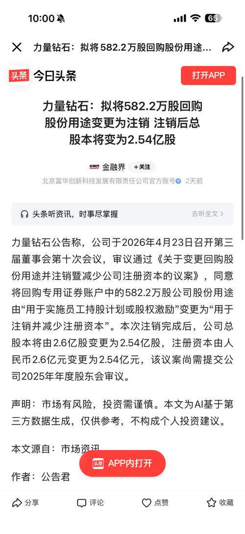 $力量钻石(SZ301071)$$四方达(SZ300179)$$节能风电(SH601016)$ 力量钻石王炸级利好!3亿市值股份直接注销,股东直接躺赢! 刚看了公司公告,这次回购注销不是小打小闹,是实打实的真金白银回报股东! 一、核心数据直接锤 •注销股份:582.2万股,占当前总股本的2.24% •按当前股价50.64元算,对应市值接近3亿元 •回购成本约2.15亿元,现在直接永久退出市场,未来...