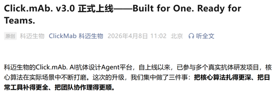 科迈生物Click.mAb.v3.0抗体设计平台上线,已参与多个真实抗体研发项目,实战效果极好!核心算法深度升级,成功案例数据亮眼,效率直接碾压传统方法。全程AI驱动,前景不可限量啊