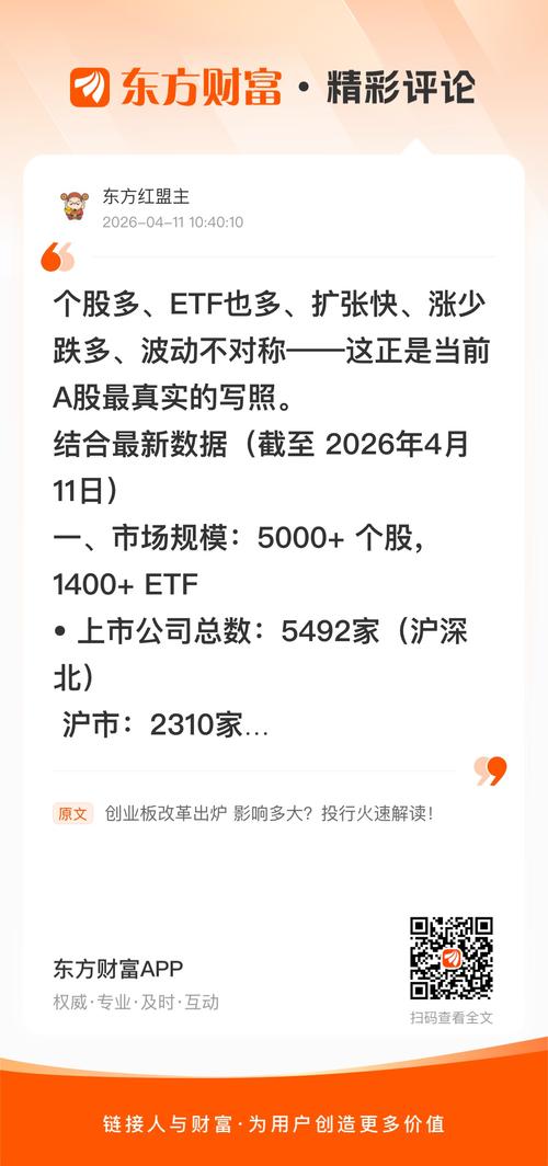 个股多、ETF也多、扩张快、涨少跌多、波动不对称——这正是当前A股最真实的写照。 结合最新数据(截至2026年4月11日) 一、市场规模:5000+个股,1400+ETF •上市公司总数:5492家(沪深北) 沪市:2310家 深市:2887家 北交所:295家 •ETF数量:约1475只(2026年一季度末) 股票ETF:约1000只(宽基+行业+主题) 债券/商品/跨境/货币:约475只 总规...