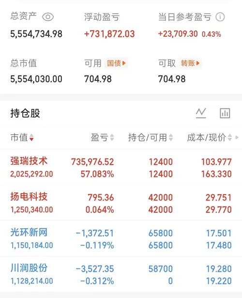 目前555w,持有$强瑞技术(SZ301128)$,$光环新网(SZ300383)$,扬电科技,$川润股份(SZ002272)$ allin算力。 号又没了,备用,成成看盘555,欢迎关注。 又是强瑞技术救命的一天,拿了好久了,快60个点了。 赞同可以突破20个吗,大家多点点赞同! 既然液冷这么给力,再做一只川润股份。 强瑞技术是好票,nv,hw,google供应链据说都进了,最近涨很多了,液冷板...