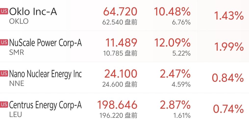 - 根据 4 月 14 日晚间的市场行情,美股核电与先进核能板块集体暴涨,核心领涨标的及涨幅如下: 核心领涨标的(按涨幅) NuScale Power (SMR):暴涨 超 17%。作为美国核管理委员会(NRC)40 多年来首批批准的非轻水反应堆开发商,其 SMR 技术备受市场认可。 Oklo Inc (OKLO):大涨 超 10%。获得 Meta 等巨头投资,并与 NRC 保持积极监管对话。 NANO Nuclear Energy:上扬 逾 10%。 Energy Fuels (UUUU):上涨 近 5%。主营铀矿开采,直接受益于铀供应长期缺口的预期。 Centrus Energy (LEU):涨幅 近 5%。美国领先的浓缩铀供应商。 Talen Energy (TLN):上涨 近 5%。美国大型发电公司,拥有大量核电资产。