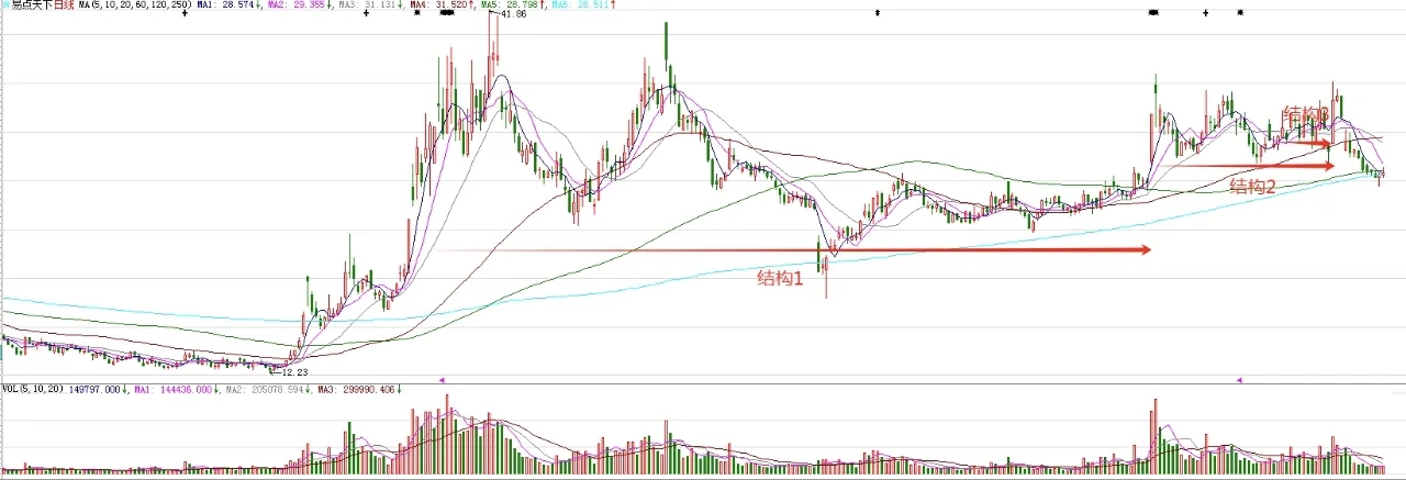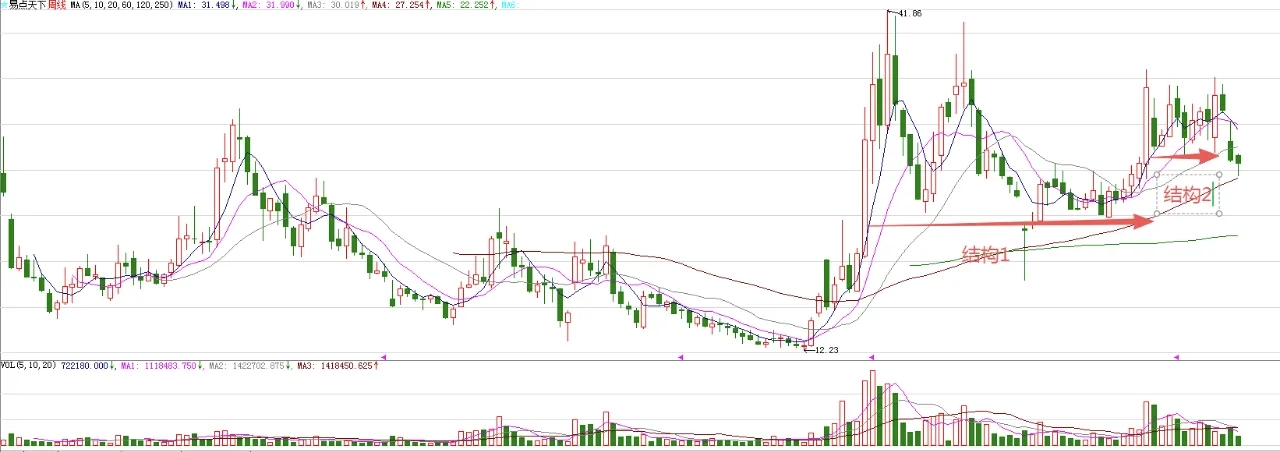 $易点天下(SZ301171)$ 周线级别的走势来看,存在超大型的中枢结构1,这个结构已经实现了有效突破,意味着股价处在比较大的上涨趋势。图中标注的结构2,是结构1突破后的回踩,也已经实现了有效突破,意味着波段上涨不远了。最近三周的调整,是结构2突破后的回踩,是正常的调整。调整,已经到了结构2的下轨,空间到了。所以,下周开始,股价有望逐步结束调整,开启波段上涨。