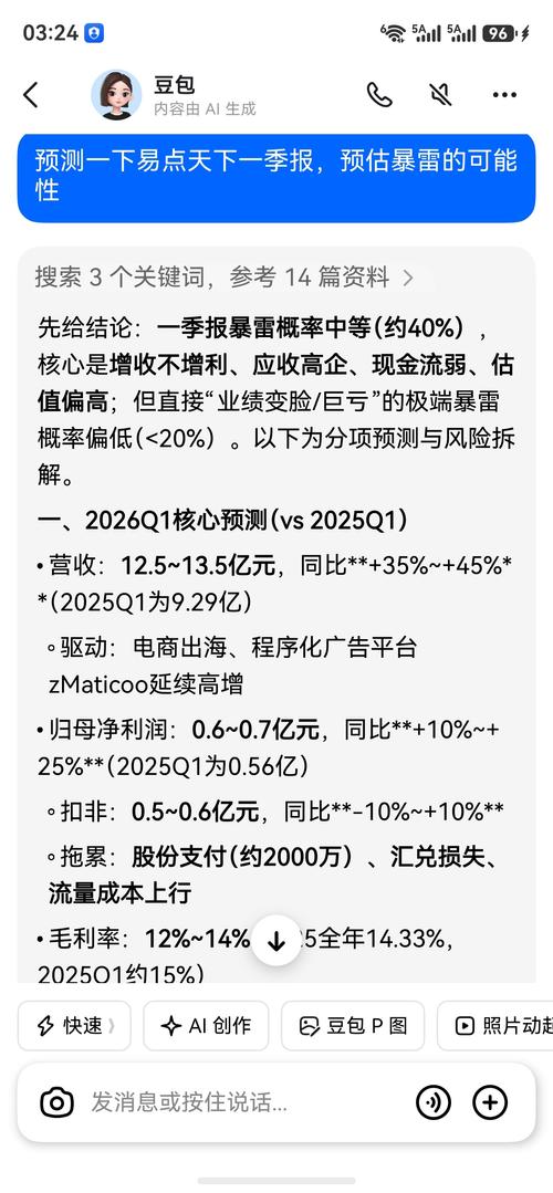 $易点天下(SZ301171)$豆包直接预测不及预期,估计暴雷的概率有40%,你们敢大仓位赌吗?
