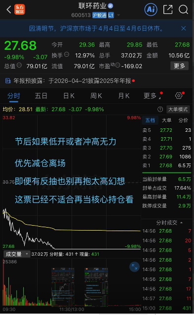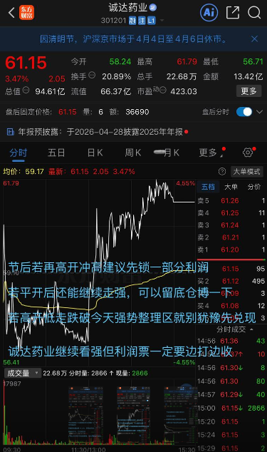 $诚达药业(SZ301201)$$联环药业(SH600513)$ 1)诚达药业: 利润在手,今天核心是“保住肉” 消息面:诚达药业走的是“创新药+CRO服务”逻辑,近期创新药情绪持续回暖,叠加公司业绩修复预期,属于资金反复博弈的活跃标的。 技术面:个股属于典型的加速拉升结构,连续放量上涨,MACD水上金叉放大,量能明显跟随,短线情绪非常强。但同时也已经进入高位区间,乖离率偏大,存在分歧加剧的风险。...