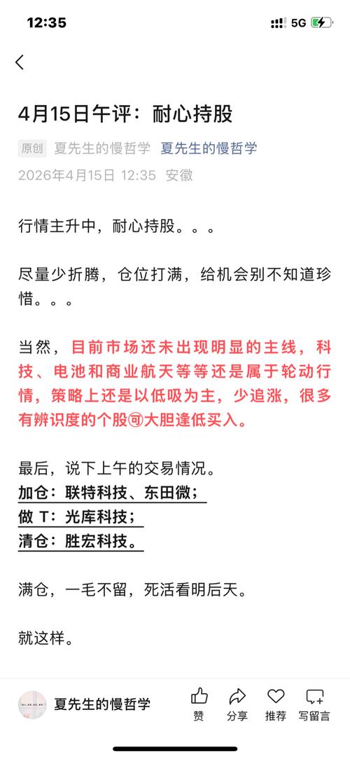 $联特科技(SZ301205)$ 4月15日午评:耐心持股 行情主升中,耐心持股。。。 尽量少折腾,仓位打满,给机会别不知道珍惜。。。 当然,目前市场还未出现明显的主线,科技、电池和商业航天等等还是属于轮动行情,策略上还是以低吸为主,少追涨,很多有辨识度的个股大胆逢低买入。 最后,说下上午的交易情况。 加仓:联特科技、东田微; 做T:光库科技; 清仓:胜宏科技。 满仓,一毛不留,死活看明后天。 就...