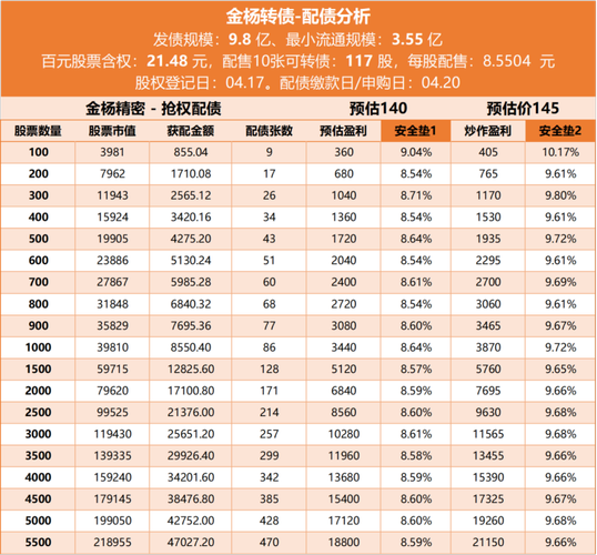 金杨转债抢权配债!04.17(9.8亿,9%,锂电池)金杨精密 1、金杨转债抢权配债分析。 金杨转债发债规模9.8亿,锂电池行业。股权登记日:04.17,百元股票含权21.48元左右,配售10张可转债约需117股。上市首日流通规模最小约3.55亿,含权高、行业热门,首日大概率达到145元,安全垫9%左右。 锂电池行业。概念有储能、人形机器人、小金属概念等。 股权登记日:04.17。 配债缴款日/申...