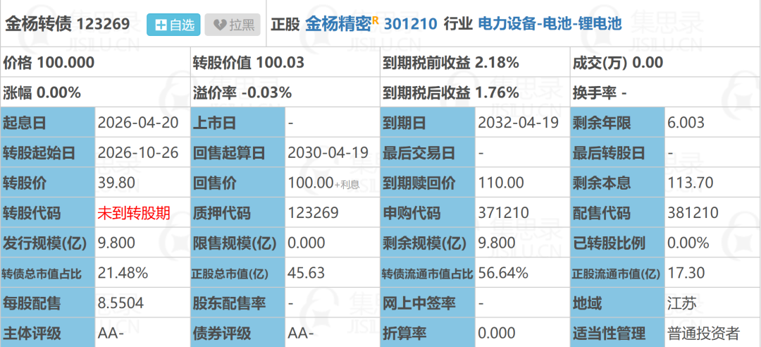 金杨转债 抢权配债!04.17(9.8亿,9%,锂电池) 金杨精密