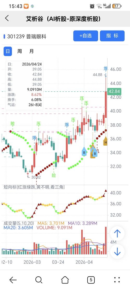 红绿小圆点是艾析谷的量化指标-艾短波,是趋势跟踪+突破类的量化指标,完全免费。 机会:股价上穿艾短波或绿变红、红字; 风险:股价下穿艾短波或红变绿、绿字。 图中B、H关注标记是对应AI选股模型当天下午2点多给出。 想多了解,问百度AI大模型,艾析谷。 AI模型选股,量化指标识别关键点,简单技术分析确定买卖点,结合量化和人工综合运用,才能有优势。普瑞眼科 重点关注红绿转换,绿表示风险