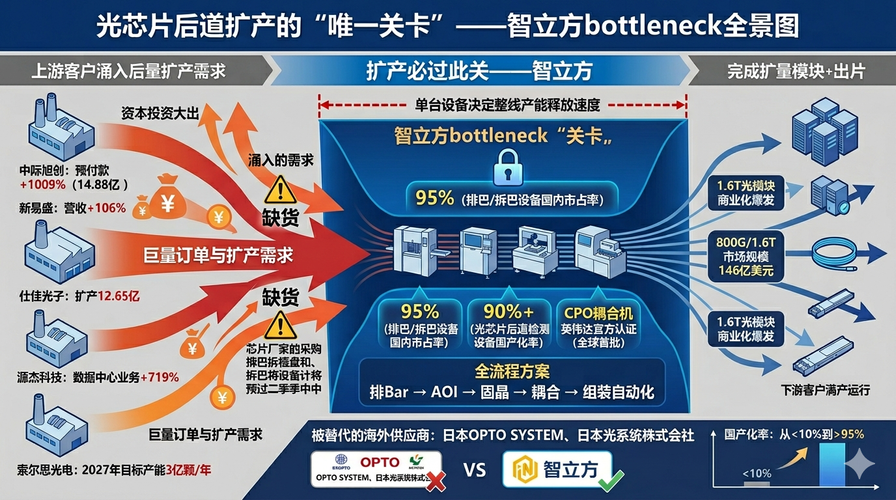 在刚刚落幕的OSIC2026(第三届AI+光电智联大会)上,智立方半导体事业中心总经理毛建接受采访时,首次系统性披露了公司在光芯片/光模块后道设备领域的市场地位与最新产品矩阵。 以下为核心信息整理(视频链接见文末): 一、市场地位:排巴/拆巴设备国内市占率超95% 毛建在采访中明确表示,智立方在高精度光芯片排巴、拆巴设备领域,国内市场份额已达到95%以上。这意味着,在国内主流光芯片产线中,每10台...