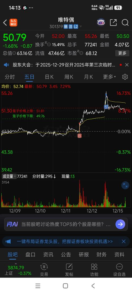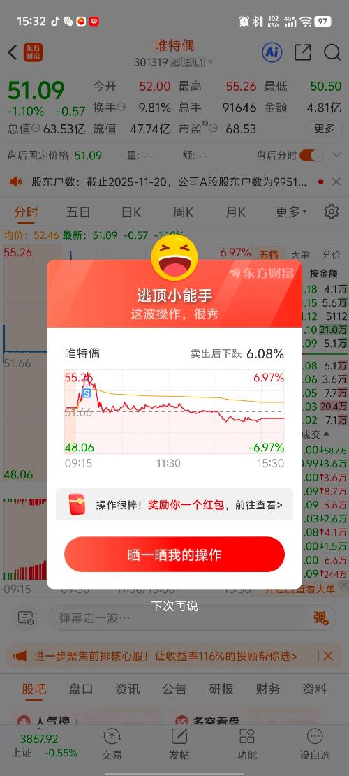 $唯特偶(SZ301319)$这个票啥鬼,突破新高就出货了