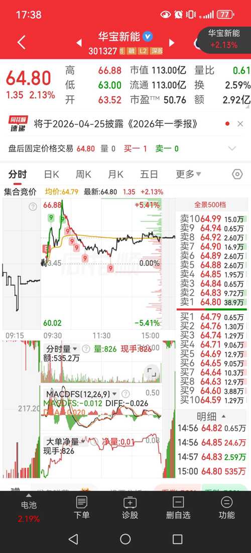 $华宝新能(SZ301327)$华宝新能(301327)—4月7日 当日表现 •收盘:64.80元,+2.13% •盘中冲高66.88元(+5%),尾盘明显回落 •成交:2.92亿,温和放量但不大 •换手率:2.59%,活跃度一般 日K&量能 •形态:小阳线、冲高回落、上影线长→反弹弱 •均线:短期走平,但无多头信号 •量能:放量不够→反弹动能不足 筹码峰 •平均成本:68.05元→现价低于成本 ...