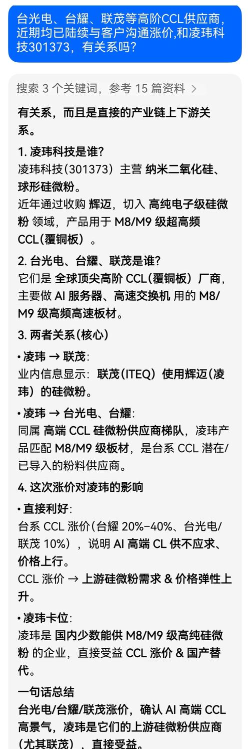 $凌玮科技(SZ301373)$ 有关系,而且是直接的产业链上下游关系。 1.凌玮科技是谁? 凌玮科技(301373)主营纳米二氧化硅、球形硅微粉。 近年通过收购辉迈,切入高纯电子级硅微粉领域,产品用于M8/M9级超高频CCL(覆铜板)。 2.台光电、台耀、联茂是谁? 它们是全球顶尖高阶CCL(覆铜板)厂商,主要做AI服务器、高速交换机用的M8/M9级高频高速板材。 3.两者关系(核心) 凌玮→联...