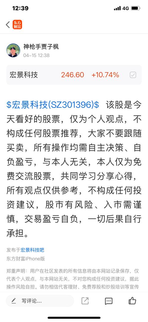 $宏景科技(SZ301396)$这个股我是4月15日发文看涨的股票,以上仅为个人观点,不构成任何股票推荐,大家不要跟随买卖,所有操作均需自主决策、自负盈亏,与本人无关,本人仅为免费交流股票,共同学习分享心得,所有观点仅供参考,不构成任何投资建议,股市有风险、入市需谨慎,交易盈亏自负,一切后果自行承担。