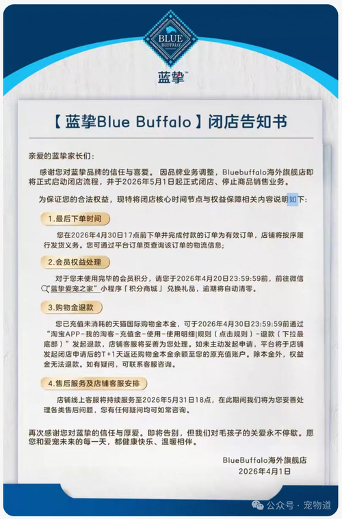 “我们需要在美国发展BlueBuffalo的业务,但同时我们也看到了美国之外的宠物食品机会,问题只是你要如何去做。”——通用磨坊全球首席执行官JeffHarmening 近日,通用磨坊旗下宠物食品品牌蓝挚(BlueBuffalo)在各大电商平台官方旗舰店发布闭店告知书,宣布店铺将于2026年5月1日起正式闭店、停止商品销售业务;与此同时,“蓝挚爱宠之家”小程序也将于近期停止运营。 4月8日,通用磨...