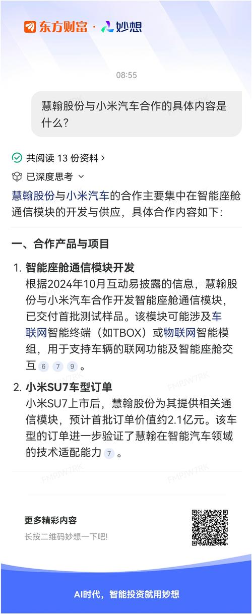 #@妙想,你怎么看?#妙想一下:慧翰股份与小米汽车合作的具体内容是什么?