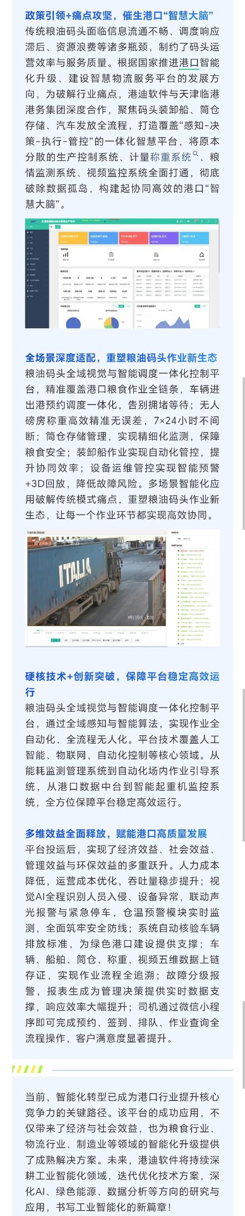 $港迪技术(SZ301633)$ 近日,由武汉港迪软件(港迪技术子公司)与天津临港港务集团有限公司联合打造的“粮油码头全域视觉与智能调度一体化控制平台”,正式投产运行。 该平台凭借领先的技术架构、显著的应用效益,获得一项发明专利(港口全自动散粮卸料方法及装置)及一项软件著作权,并顺利通过天津市科学技术研究所组织的专家评审,被评定为“总体技术达到国际先进水平”。