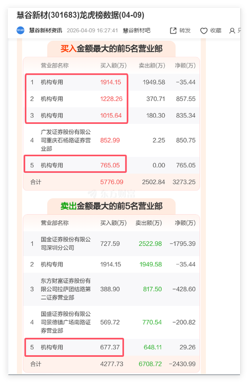 资讯 慧谷新材(301683)龙虎榜数据(04-09)