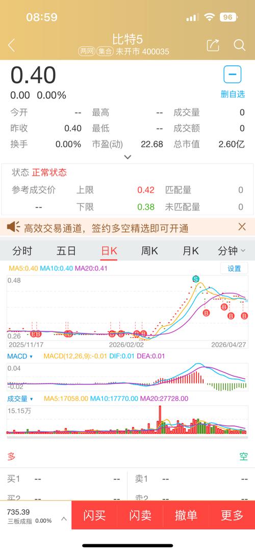 从比特5的月k线全景图看,其在老三板内最高价2.78,最低价0.26,现价0.39仍处于 历史大底部区域,上涨空间巨大!该股去年的年收盘价0.28,今年至今涨幅39.29%, 现价仍在10周均线和20月均线0.37之上,中长期上涨趋势尚在。该股半年报很不错, 每股收益0.009,现价0.39对应的动态市盈率22.11;每股净资产0.577,现价0.39对应 的市净率0.68,仍然严重破净;该股去年...