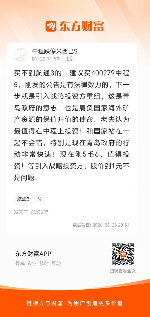 买不到航通3的,建议买400279中程5,刚发的公告是有法律效力的,下一步就是引入战略投资方重组,这是青岛政府的意志,也是肩负国家海外矿产资源的保值升值的使命。老夫认为最值得在中程上投资!和国家站在一起不会错,特别是现在青岛政府的行动非常快速!现在刚5毛6,值得投资!等引入战略投资方,股价到1元不是问题!