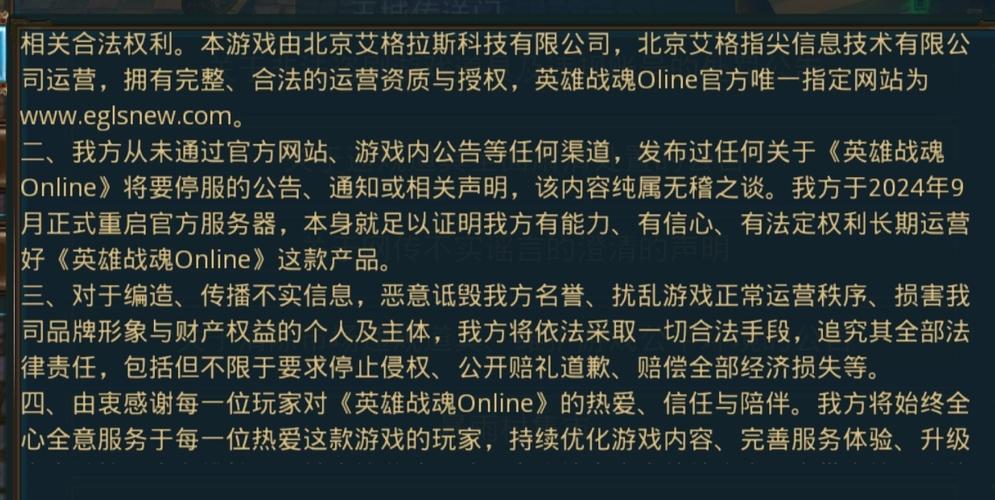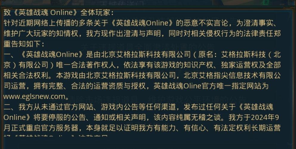 $R艾格1(SZ400118)$ 致《英雄战魂Online》全体玩家: 针对近期网络上传播的多条关于《英雄战魂Online》的恶意不实言论,为澄清事实、维护广大玩家的知情权,我方现作出澄清与声明,同时对相关侵权行为的法律责任郑重告知如下: 一、《英雄战魂Online》是由北京艾格拉斯科技有限公司(原名:艾格拉斯科技(北京)有限公司)唯一合法著作权人,依法享有该游戏的知识产权、独家运营权及全部相关合...