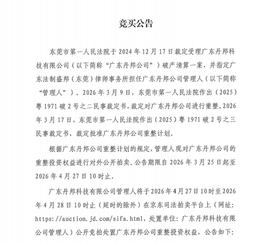 广东丹邦将于4月27日上午10点到4月28日上午10点拍卖。