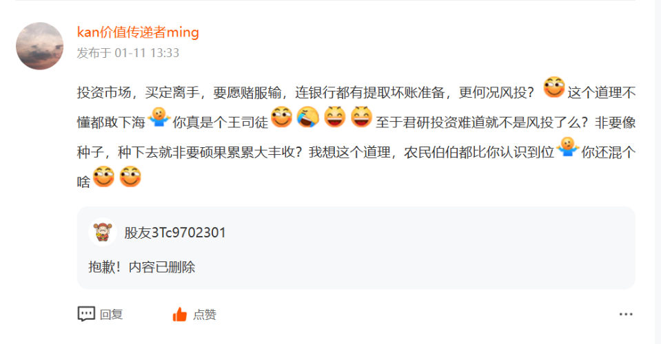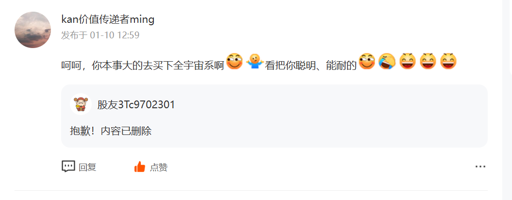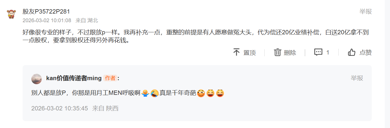 那个哈B在扰乱思维!他目的就是不让别人看清环球价值所在!哈哈哈!不懂可以学呀?我在谈的股东质押回购纠徘!是大股东与信托!券商质押后产生分歧!他把这些说成我!哈哈哈!不是有B就是寸!儿捌子在谈到股票都卖完了!不值钱了!我在担心信托!券商他们的钱又咋办呢!手上只拿环球股票吗?哈哈哈!
