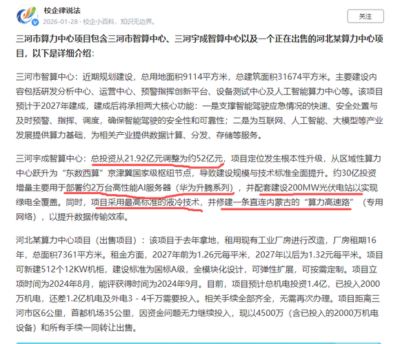 - 三河宇成智算中心投资预算从21.92亿元剧增至约52亿元,根本原因并非简单的成本超支,原因是战略定位发生了根本性变化,即从区域性商业智算中心到"东数西算"京津冀国家级枢纽节点。投资必须满足国家枢纽在规模、性能、绿色和网络互联上的顶级标准,而非仅仅经济可行。新增的约30亿投资,精准投向了定义其“国家级枢纽”地位的四个核心领域:一是算力规模支柱(华为昇腾服务器集群),内容:新增约2万台高性能AI服务器。二是 绿色能源支柱(200MW光伏电站),内容:配套建设光伏电站,目标绿电全覆盖。三是技术标杆支柱(最高标准液冷技术),内容:采用顶级液冷方案。四是直连内蒙古的“算力高速路”,内容:修建直连内蒙古的专用网络。