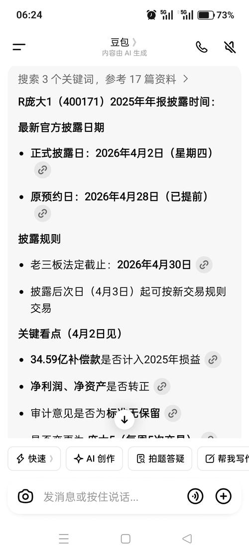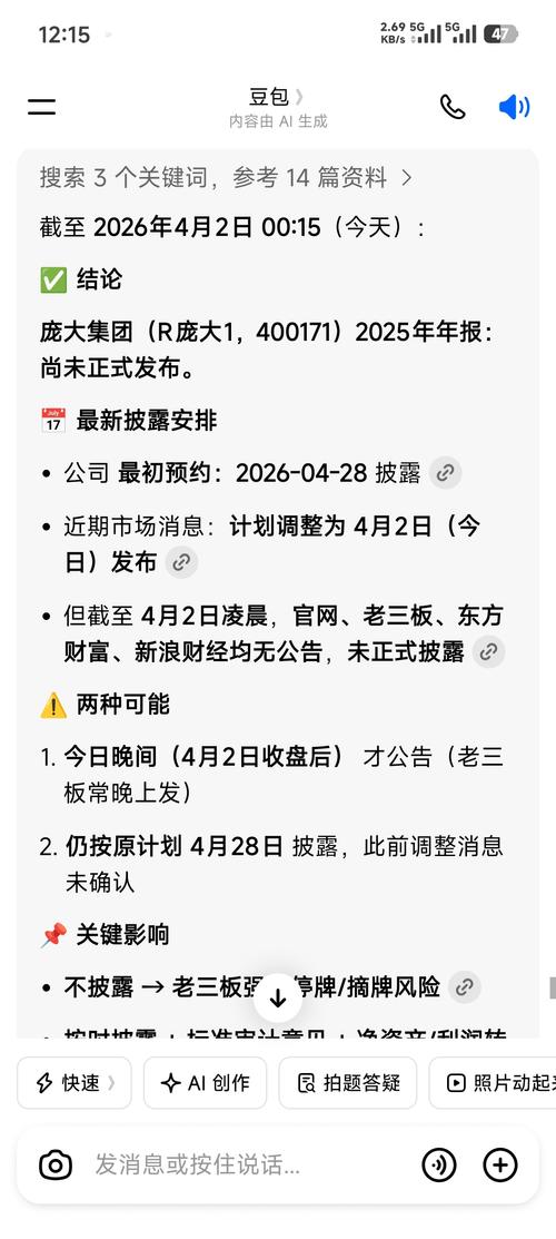 一、信息真实性拆解(分点验证)1.年报披露时间:部分属实,需以官方公告为准-原预约日4月28日:完全属实。根据庞大集团2026年2-3月的公开信息,公司最初预约2025年年报披露时间为2026年4月28日,符合老三板年报披露规则(次年4月30日前)。-正式披露日4月2日(提前):仅为市场预期/自媒体预测,非官方最终公告。截至2026年4月2日,全国中小企业股份转让系统、庞大集团官网均未发布正式的年...