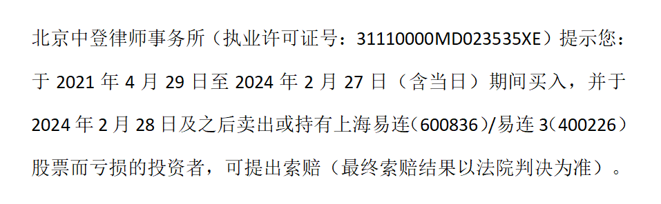 上海易连索赔登记。示范案例处于一审审理程序中。上海则真律师事务所张猛律师团队提示:2020年11月01日至2024年02月27日(含)期间有买入,无论在2024年02月27日后卖出或继续持有,受损投资者可工号“索赔集结号”登记。