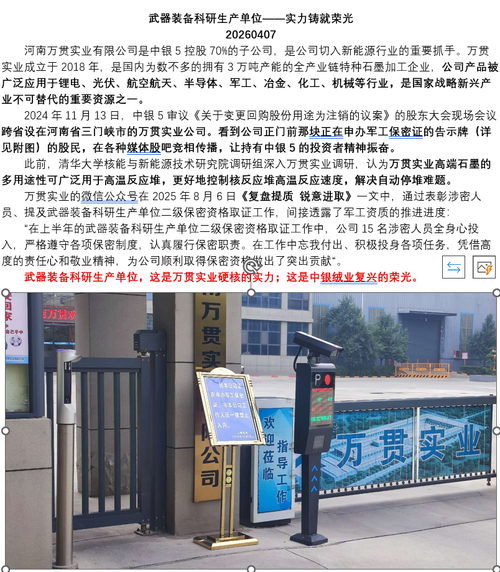 武器装备科研生产单位——实力铸就荣光 20260407 河南万贯实业有限公司是中银5控股70%的子公司,是公司切入新能源行业的重要抓手。万贯实业成立于2018年,是国内为数不多的拥有3万吨产能的全产业链特种石墨加工企业,公司产品被广泛应用于锂电、光伏、航空航天、半导体、军工、冶金、化工、机械等行业,是国家战略新兴产业不可替代的重要资源之一。 2024年11月13日,中银5审议《关于变更回购股份用途...