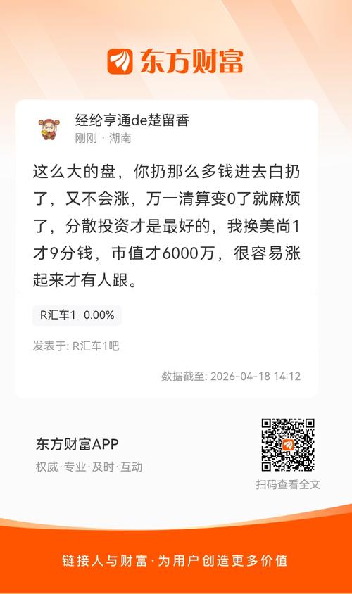 这么大的盘,你扔那么多钱进去白扔了,又不会涨,万一清算变0了就麻烦了,分散投资才是最好的,我换美尚1才9分钱,市值才6000万,很容易涨起来才有人跟。