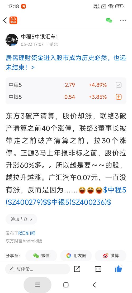 万科那么多的债务不是也基本违约了吗?万科A的股价不也高高在上吗?R汇车1所欠的债务比万科少多啦!所以你们不要总是自己吓自己啦!整天说什么“破产清算归零”哟!昨天在老三板里成交额超过2000万元的就只有R汇车1、中银5和东方3咯。特别是东方3,明知道是不出年报,竟然还有很多人在买入哦!