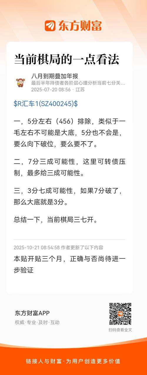 $R汇车1(SZ400245)$各阶层有各阶层的生存法则。R汇车1适合大佬玩,对于想大显身手的大佬来说R汇车1是一个很好的平台,估计也有不少大佬在盯着,时机成熟了就会出手的,我们小股东就静等风来就好