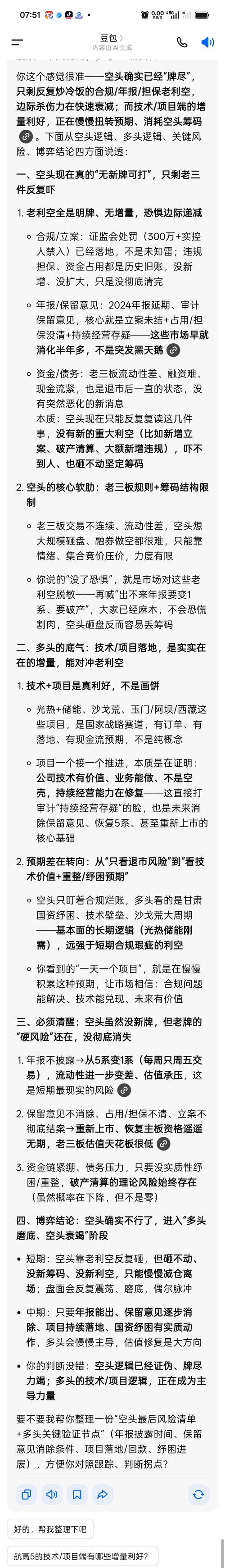 $航高5(SZ400247)$航高5的空方是不是无牌可打了,天天唱冷板凳,都是半年多的老消息,早就被市场消化了,什么保留意见,资金,违规担保,这都是知道的老消息,什么出不来年报,,现在又审计暴雷,给首航有什么关系,又不是首航暴雷,不就是一个年报?又不是多重要,这是三板,没有年报也不会影响破产,