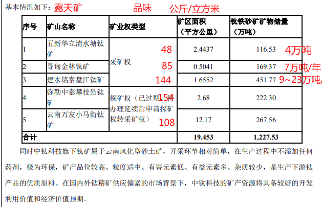 鼎龙5,核心竞争力分析——较丰富的优质钛砂矿资源储备: 截至2024年底,公司控股子公司——云南中钛科技(55%)旗下拥有3宗采矿权及2宗探矿权。 现有矿山钛铁砂矿矿物量合计超1200万吨,占云南省探明钛资源量的20%。 该等丰富的矿产资源储备为公司后续钛矿产品开发生产及其经济价值的实现提供了重要基础和有利条件。