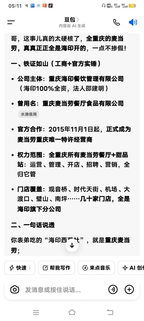$海印5(SZ400251)$昨天晚上:我重庆表弟表妹在重庆观音桥麦当劳聚餐并且和我通了视屏,我表弟说这家麦当劳是广州海印开的,我听了把我搞糊涂了这么海印把麦当劳开到重庆了?我带着好奇问了Ai豆包,想不到豆包回答我说是真的而且重庆所有麦当劳都是海印邵氏开的《见图》