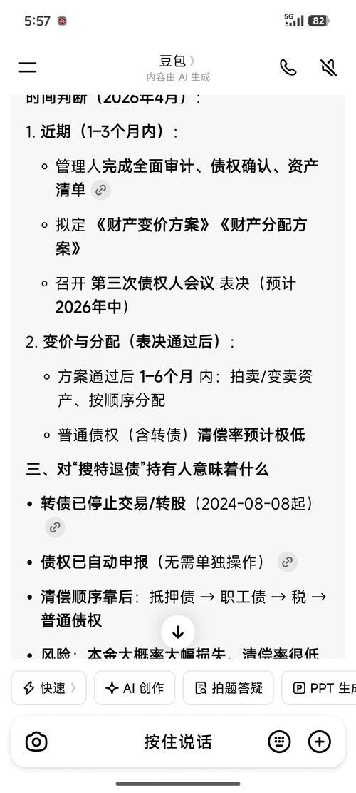 $搜特退债(SZ404002)$3.债权清偿:有财产担保债权:全额现金清偿,普通债权:5万以下全额,5万以上清偿率约22.2%;