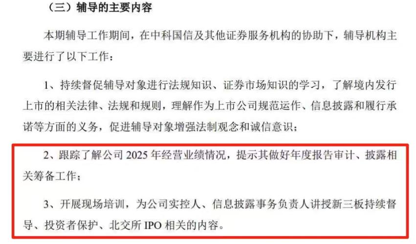 $中科国信(SZ430062)$本期辅导工作期间,在中科国信及其他证券服务机构的协助下,辅导机构主 要进行了以下工作: 1、持续督促辅导对象进行法规知识、证券市场知识的学习,了解境内发行 上市的相关法律、法规和规则,理解作为上市公司规范运作、信息披露和履行承 诺等方面的义务,促进辅导对象增强法制观念和诚信意识; 2、跟踪了解公司2025年经营业绩情况,提示其做好年度报告审计、披露相 关筹备工作; ...