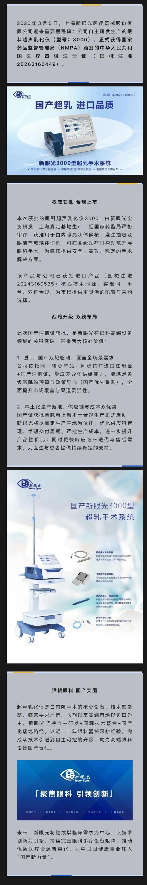 新眼光国产眼科超声乳化仪3000获NMPA三类注册证,进口+国产双线布局正式落地!