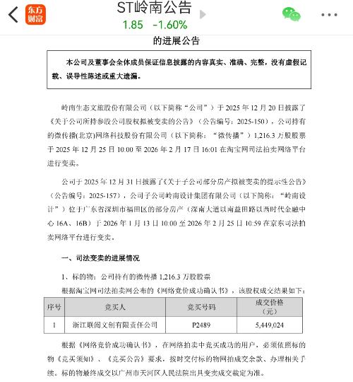 微传播的大股东拟变更,浙江联阅文创以544.9万拍得st岭南变卖的1216.3万股。