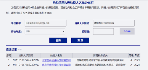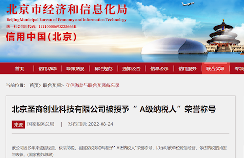 国家税务总局授予圣商创业“A级纳税人”荣誉称号