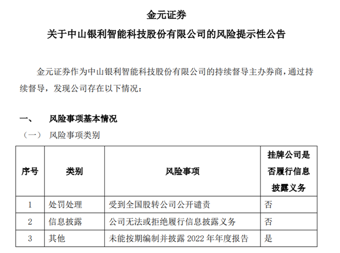 公告 ST银利:金元证券关于中山银利智能科技股份有限公司的风险提示性公告