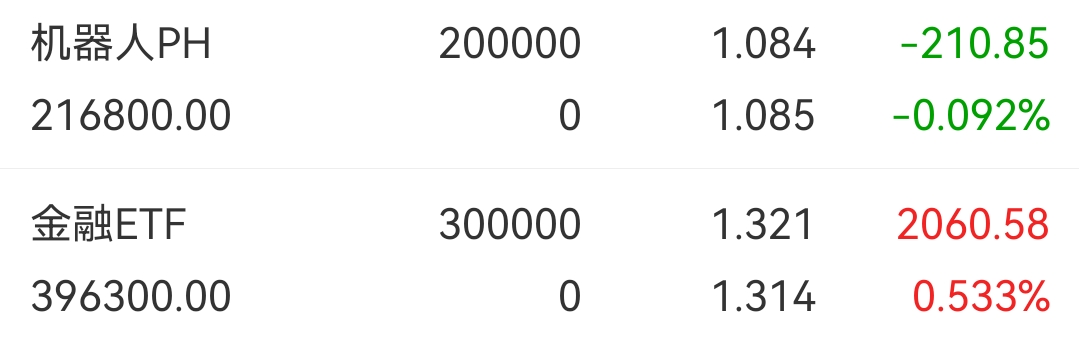 $养殖ETF(SZ159865)$ $机器人ETF鹏华(SZ159278)$ $金融ETF(SH510230)$ 可惜仓位很低,明天早盘如果有机会,逢低加仓金融ETF(SH510230)。 对科技板块也是利好。