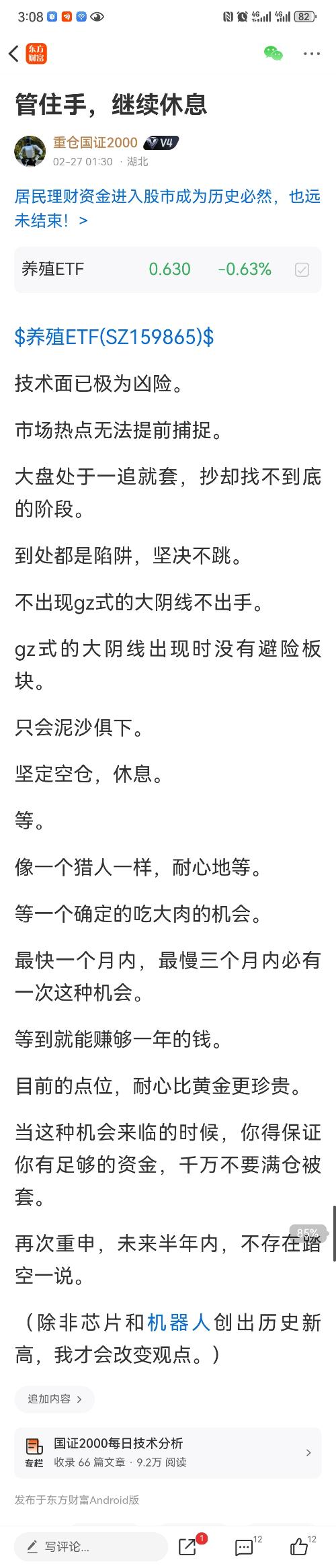 $养殖ETF(SZ159865)$ $机器人ETF鹏华(SZ159278)$ $金融ETF(SH510230)$ 图下面文末有三月份的策略。 上周天天喊大阴线,终于被我喊出来了。 明天会怎样?敢抄底吗? 今天确实出了大阴线,但是回调没到位啊! 不排除明天再次拉升诱多的可能,毕竟这么大的跌幅(国证2000是4%的跌幅,机器人5%,航空航天,军工几乎跌停),不反弹一下说不过去。 但怎知不是接飞刀? 昨...