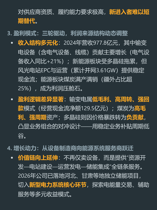 $浦发银行(SH600000)$$中国西电(SH601179)$$平高电气(SH600312)$很多人把特变电工当成特高压加新能源的双赛道白马,其实拆开看它是典型的对冲型生意,赚的是周期错配的钱。 它现在三条业务线并行,传统输变电是民企龙头,全球变压器产能稳居前三,吃国内特高压建设和一带一路的工程订单,截至2024年底待执行海外合同超50亿美元,这块是稳基本盘的核心。 手上攥着120亿吨低成本露天...